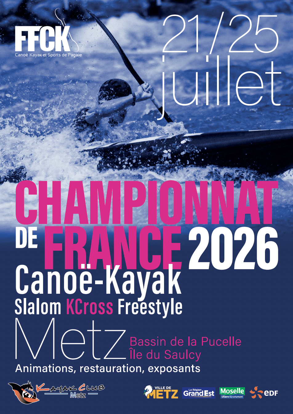 Les Championnats de France de Slalom, Kayak Cross et Freestyle se tiendront du 21 au 25 juillet 2026 sur le Bassin de la Pucelle Île du Saulcy à Metz.